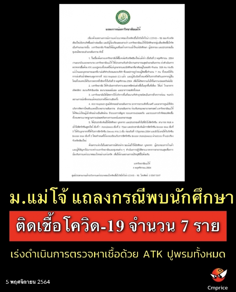 | • ม.แม่โจ้ แถลงกรณีพบนักศึกษาติดเชื้อโควิด-19 จำนวน 7 ราย |