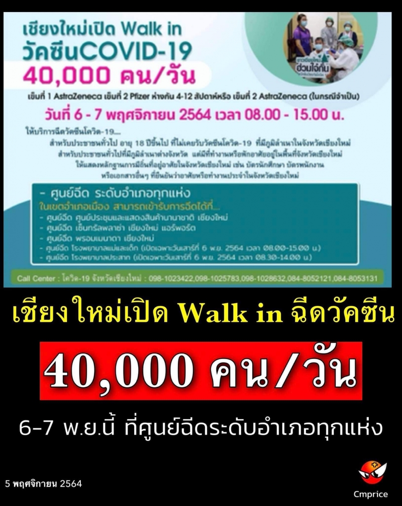 6-7พ.ย.64 เชียงใหม่เปิด Walkin ฉีดวัคซีน 2 วัน 40,000โดส(AZ-Pfizer)