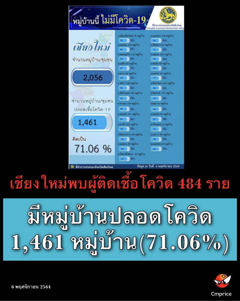 เชียงใหม่พบผู้ติดเชื้อเพิ่ม 484 รายมีหมู่บ้านปลอดโควิด 1,461 หมู่บ้าน(71.06%)