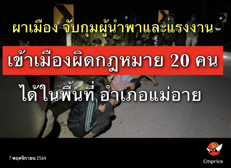 พล.ต.นฤทธิ์ ถาวรวงษ์ ผู้บัญชาการกองกำลังผาเมือง เปิดเผยว่า ภายหลังจากที่ กองบังคับการควบคุมทหารพรานศูนย์ปฏิบัติการกองทัพภาค 3 บูรณาการหน่วยงานที่เกี่ยวข้องตั้งจุดตรวจจุดสกัดการลักลอบค้ายาเสพติด แรงงานผิดกฎหมายในพื้นที่ เมื่อ เวลา 01.30 น. วันนี้ (7 พ.ย. 64) กองร้อยทหารพรานที่ 3202 กองบังคับการควบคุมทหารพรานศูนย์ปฏิบัติการกองทัพภาค 3 ได้ตรวจค้นรถกระบะ ยี่ห้อนิสสัน สีบรอนซ์ หมายเลขทะเบียน ผต 4612 เชียงราย ที่จุดตรวจบริเวณ บ้านห้วยคอกหมู หมู่ 7 ตำบลแม่นาวาง อำเภอแม่อาย จังหวัดเชียงใหม่ สามารถจับกุม นายดวง แสงอารุณ อยู่บ้านเลขที่ 51 หมู่ 6 ตำบลท่าตอน อำเภอแม่อาย จังหวัดเชียงใหม่ เป็นผู้นำพาแรงงานต่างด้าวเข้าเมือง พร้อมผู้ลักลอบเข้าเมืองโดยผิดกฎหมาย สัญชาติเมียนมา จำนวน 20 คน เป็น ชาย 9 คน และหญิง 11 คน ซึ่งจากการสอบถามทราบว่า ทั้งหมดเดินทางมาจาก บ้านอ่อง เมืองตองจี สหภาพเมียนมา ผ่านช่องทางปางตอง ตำบลม่อนปิ่นอำเภอฝาง จังหวัดเชียงใหม่ โดยเสียค่าใช้จ่ายคนละ 15,000 - 20,000 บาท เพื่อมาทำงานสวนส้มในพื้นที่ อำเภแแม่อาย จังหวัดเชียงใหม่ จึงได้นำผู้ต้องหาส่ง สภ.แม่อาย เพื่อดำเนินคดีตามกฎหมายต่อไป