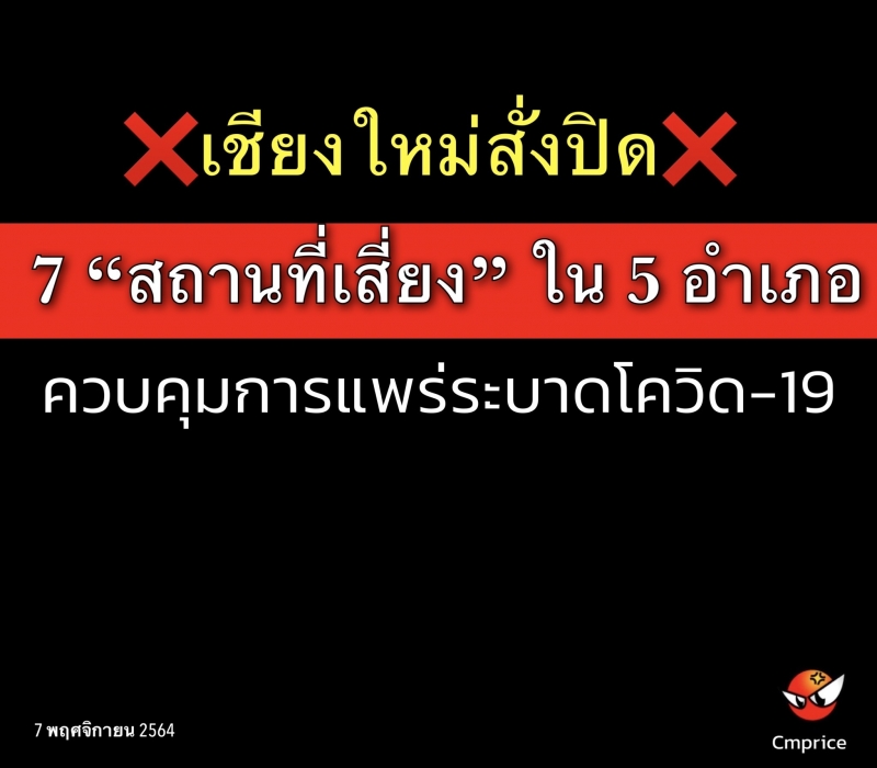 คณะกรรมการโรคติดต่อจังหวัดเชียงใหม่ มีมติสั่งปิด 7 “สถานที่เสี่ยง” ใน 5 อำเภอ เพื่อควบคุมการแพร่ระบาดของโควิด-19 หลังพบมีการติดเชื้อเป็นกลุ่มก้อนทั้งในชุมชน หอพัก และแคมป์คนงาน