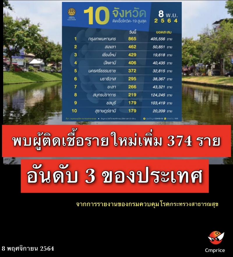 เชียงใหม่พบผู้ติดเชื้อรายใหม่ 374ราย จากการรายงานของกรมควบคุมโรค กระทรวงสาธารณสุขเป็นอันดับ3ของประเทศ