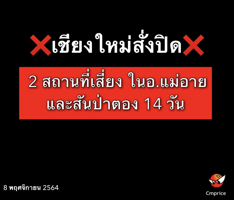 นายประจญ ปรัชญ์สกุล ผู้ว่าราชการจังหวัดเชียงใหม่ ในฐานะประธานคณะกรรมการโรคติดต่อจังหวัดเชียงใหม่ ผู้กำกับการบริหารราชการในสถานการณ์ฉุกเฉินจังหวัดเชียงใหม่ ลงนามคำสั่งคณะกรรมการโรคติดต่อจังหวัดเชียงใหม่ โดยสั่งปิดสถานที่เสี่ยงเพิ่มอีก 2 แห่งในอำเภอแม่อาย และอำเภอสันป่าตอง เป็นการชั่วคราว เพื่อควบคุมและป้องกันโรคในพื้นที่ ภายหลังพบการติดเชื้อโรคโควิด–19 เป็นกลุ่มก้อน โดย ให้ปิดพื้นที่ตลาดสดโชคบรรจง หมู่ที่ 7 ตำบลแม่อาย อำเภอแม่อาย จังหวัดเชียงใหม่ เป็นระยะเวลา 3 วัน ระหว่างวันที่ 9 – 11 พฤศจิกายน 2564 และปิดพื้นที่แคมป์คนงานศูนย์อาชีวศึกษา บริเวณทิศตะวันออกวัดศรีปันเงิน หมู่ที่ 11 ตำบลยุหว่า อำเภอสันป่าตอง จังหวัดเชียงใหม่ เป็นระยะเวลา 14 วัน ระหว่างวันที่ 8 – 21 พฤศจิกายน 2564 เพื่อป้องกันไม่ให้เกิดการแพร่ระบาดเป็นวงกว้าง และเป็นการยกระดับมาตรการการเฝ้าระวัง ควบคุม ป้องกันการแพร่ระบาดโรคโควิด - 19 ให้เป็นไปอย่างมีประสิทธิภาพ