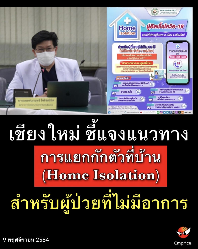 วันนี้ (9 พ.ย. 64) ที่ห้องประชุม 4 อาคารอำนวยการ ศาลากลางจังหวัดเชียงใหม่ นายแพทย์นเรนทร์ โชติรสนิรมิต ผู้อำนวยการโรงพยาบาลมหาราชนครเชียงใหม่ ชี้แจงแนวทางการแยกกักตัวที่บ้านสำหรับผู้ติดเชื้อโควิด-19 ที่ไม่มีอาการ หรือ Home Isolation ของจังหวัดเชียงใหม่ ในการแถลงข่าวสื่อมวลชนประจำสัปดาห์ว่า การทำ Home Isolation เป็นการลดความแออัดในโรงพยาบาลต่างๆ โดยผู้ติดเชื้อที่สามารถเข้าสู่ระบบ Home Isolation ได้นั้นจะต้องตรงตามเงื่อนไข 7 อย่าง ประกอบด้วย 1.เป็นผู้ป่วยที่ติดเชื้อโควิด-19 โดยมีผลตรวจ RT-PCR หรือ ATK เป็นบวก 2. เป็นผู้ติดเชื้อที่ไม่มีอาการหายใจหอบเหนื่อย แน่นหน้าอก เจ็บหน้าอกเวลาหายใจ 3. มีอายุน้อยกว่า 60 ปี ไม่อยู่ในกลุ่ม 7 กลุ่มโรคเรื้อรัง รวมทั้งไม่มีภาวะอ้วน 4. มีสุขภาพร่างกายแข็งแรง สามารถช่วยเหลือตัวเองได้ 5. พักอาศัยอยู่คนเดียวหรือที่พักอาศัยมีห้องสามารถแยกอยู่คนเดียวได้ 6. สามารถสื่อสารและปฏิบัติตามคำแนะนำของแพทย์และทีมผู้ให้การดูแลรักษาได้ 7. สามารถใช้อุปกรณ์ตรวจวัดสัญญาณชีพหรืออุปกรณ์ตรวจวัดค่าออกซิเจนในเลือดได้ด้วยตนเอง ทั้งนี้ สำหรับผู้ติดเชื้อที่พักอาศัยอยู่ในเขตอำเภอเมืองเชียงใหม่จะอยู่ในความดูแลของโรงพยาบาลมหาราชนครเชียงใหม่ และผู้ติดเชื้อนอกพื้นที่จะอยู่ในความรับผิดชอบของโรงพยาบาลประจำอำเภอ
