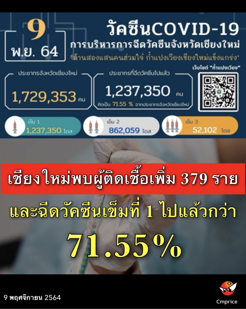 เชียงใหม่พบผู้ติดเชื้อเพิ่ม 379 รายและฉีดวัคซีนเข็มที่ 1 ไปแล้วกวว่า 71.55%