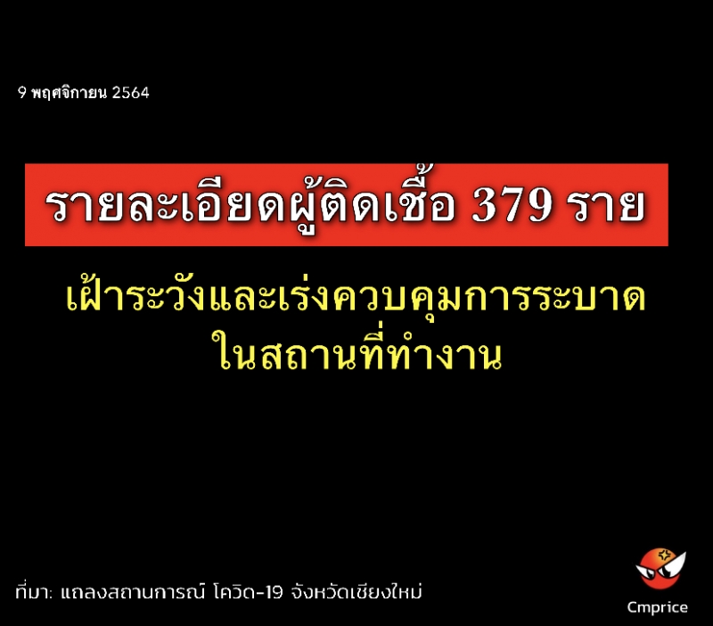 วันนี้ (9 พ.ย. 64) ดร.ทรงยศ คำชัย หัวหน้ากลุ่มงานควบคุมโรคติดต่อ สำนักงานสาธารณสุขจังหวัดเชียงใหม่ เปิดเผยสถานการณ์โรคโควิด-19 จังหวัดเชียงใหม่ ประจำวัน ว่า ผู้ติดเชื้อรายใหม่ 379 ราย เป็นผู้ติดเชื้อที่เดินทางมาจากต่างจังหวัด 3 ราย ที่เหลือเป็นผู้ติดเชื้อในจังหวัด โดยมาจากคลัสเตอร์ต่าง ๆ ประกอบด้วย คลัสเตอร์ใหม่และคลัสเตอร์ที่มีการระบาดอย่างต่อเนื่อง จำนวน 20 คลัสเตอร์ รวมผู้ติดเชื้อ 75 ราย ได้แก่ แคมป์คนงานกอไผ่ หมู่ 6 บ้านกองทรายตำบลหนองผึ้ง อำเภอสารภี 12 ราย, ชุมชนหมู่ 6 ตำบลสันติสุข อำเภอดอยหล่อ 8 ราย, หอพักป้าอี๊ด หมู่ 4 ตำบลสันพระเนตร อำเภอสันทราย 8 ราย, บริษัท Indeed Creation 7 ราย, บริษัทเชียงใหม่ริมดอย หมู่ 4 ตำบลหนองควายอำเภอหางดง 6 ราย, งานศพ ซอย 9 ตำบลหนองหอย อำเภอเมือง 4 ราย, โรงแรมพรพิงค์ 6 ราย ที่เหลือเป็นคลัสเตอร์เล็ก ๆ ที่พบผู้ติดเชื้อรายใหม่แห่งละ 1-2 ราย