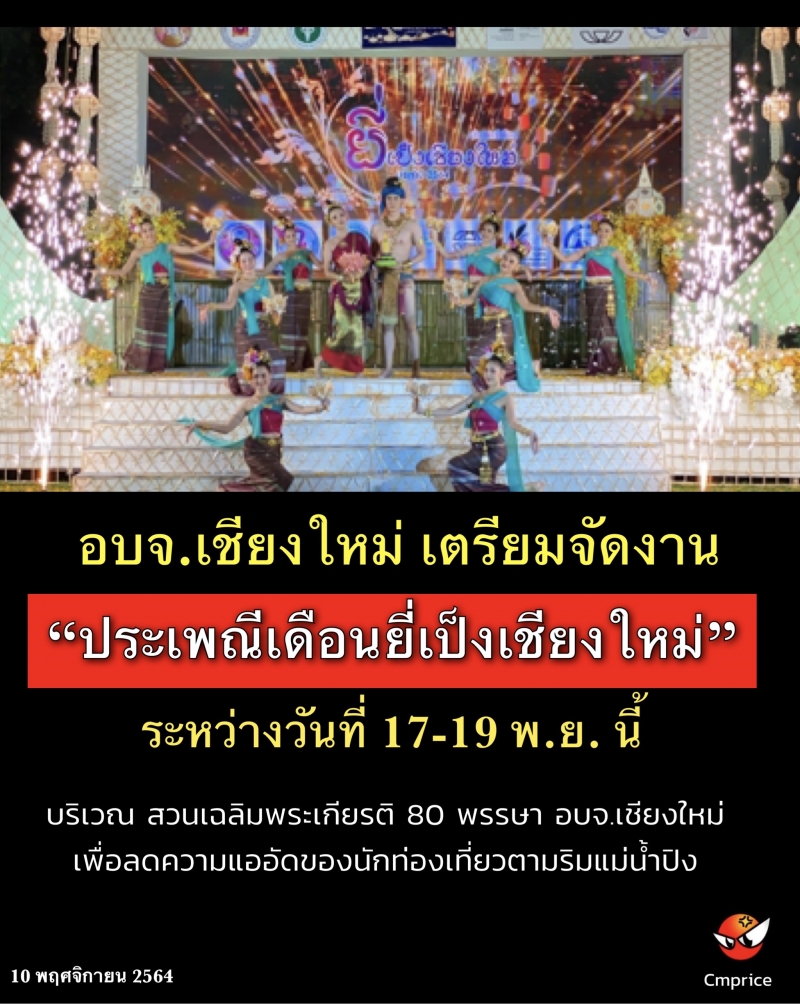 | • อบจ.เชียงใหม่ เตรียมจัดงาน "ประเพณีเดือนยี่เป็งเชียงใหม่ ระหว่างวันที่ 17-19 พ.ย. นี้ |