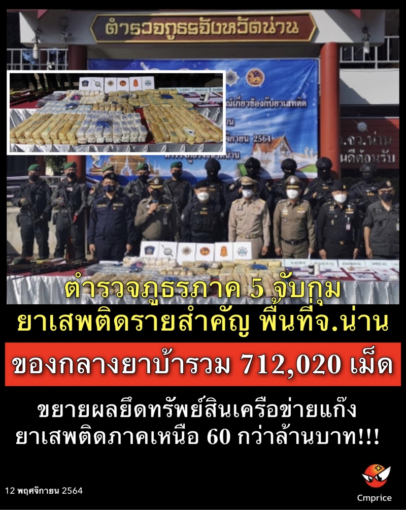 ตำรวจภูธรภาค 5 จับกุมยาเสพติดรายสำคัญพื้นที่จ.น่าน ของกลางยาบ้ารวม 712,020 เม็ดขยายผลยึดทรัพย์สินเครือข่ายแก๊งยาเสพติดภาคเหนือ 60 กว่าล้านบาท