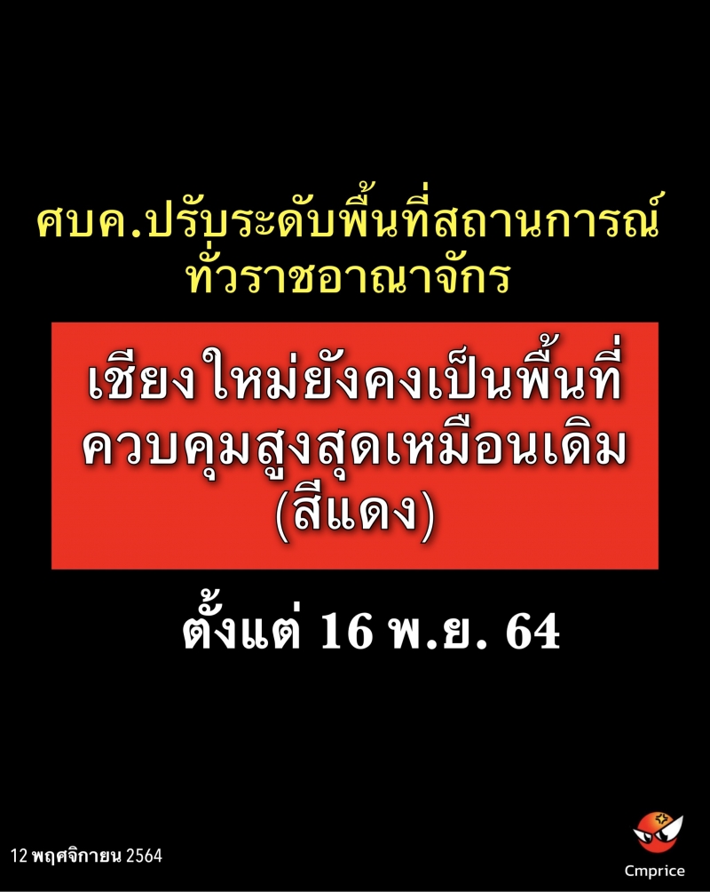ศบค.ปรับระดับพื้นที่สถานการณ์ทั่วราชอาณาจักร เริ่ม 16 พ.ย. 64 โดยเชียงใหม่ยังคงเป็นพื้นที่ควบคุมสูงสุด(สีแดง)เหมือนเดิม