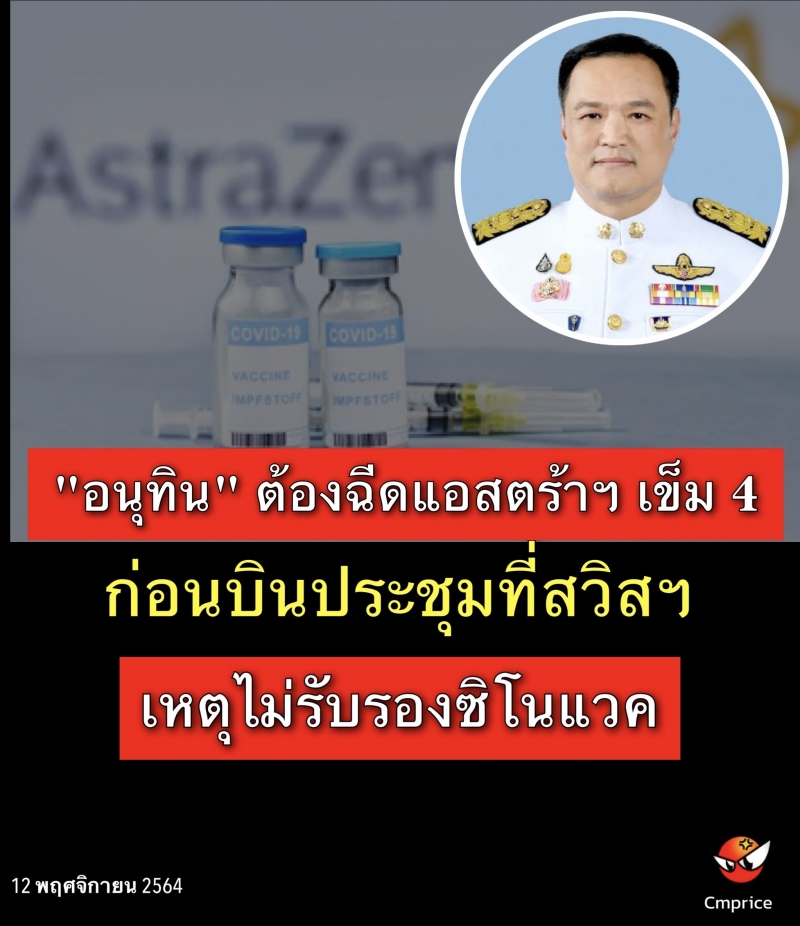 | • "อนุทิน" ต้องฉีดแอสตร้าฯ เข็ม 4 ก่อนบินประชุมที่สวิสฯ เหตุไม่รับรองซิโนแวค |