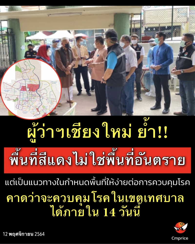 ผู้ว่าราชการจังหวัดเชียงใหม่ เน้นย้ำ พื้นที่สีแดงไม่ใช่พื้นที่อันตราย แต่เป็นพื้นที่เป้าหมายกำกับดูแลการควบคุมโรคของจังหวัดเชียงใหม่ พร้อมเร่งตรวจเชิงรุกด้วยชุดตรวจ ATK แยกผู้ติดเชื้อเข้าสู่ระบบการรักษาให้เร็วที่สุด