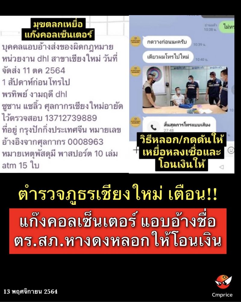 ตำรวจภูธรเชียงใหม่ เตือน!!แก๊งคอลเซ็นเตอร์ แอบอ้างชื่อตร.สภ.หางดงหลอกให้โอนเงิน
