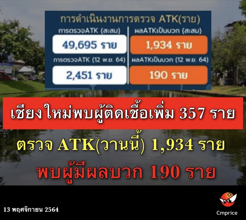 เชียงใหม่พบผู้ติดเชื้อรายใหม่เพิ่ม 357 ราย ตรวจ ATK (12 พ.ย. 64) 1,934 ราย พบผู้มีผลบวก 190 ราย