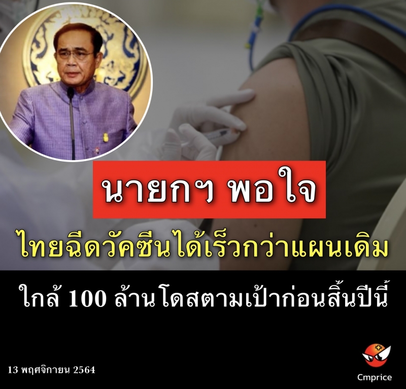 นายธนกร วังบุญคงชนะ โฆษกรัฐบาล เผย พลเอก ประยุทธ์ จันทร์โอชา นายกรัฐมนตรี และ รมว.กลาโหม พอใจภาพรวมการฉีดวัคซีนโควิด-19 ไทย เดินหน้าได้อย่างรวดเร็วกว่าแผนที่ตั้งไว้เดิม กระทรวงสาธารณสุข คาดว่าไทยจะบรรลุเป้าหมายการฉีดวัคซีนโควิด-19 ได้ 100 ล้านโดส ในปลายเดือน พ.ย. นี้ ซึ่งเร็วกว่าแผนเดิมถึง 1 เดือน