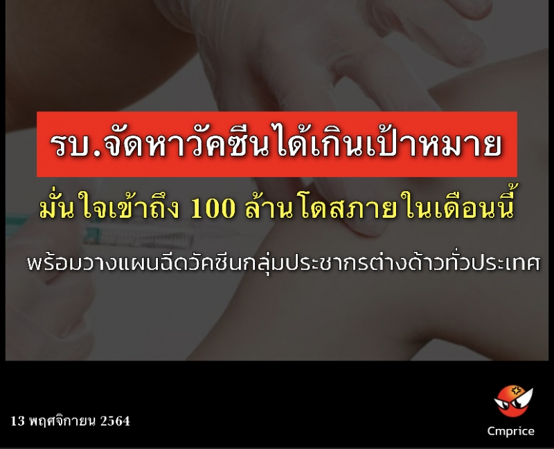 | • รบ.จัดหาวัคซีนได้เกินเป้าหมาย มั่นใจเข้าถึง 100 ล้านโดสภายในเดือนนี้ พร้อมวางแผนฉีดวัคซีนกลุ่มประชากรต่างด้าวทั่วประเทศ |