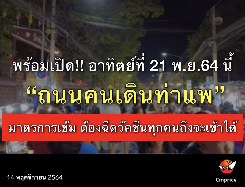 | • พร้อมเปิด!! ถนนคนเดินวันอาทิตย์ 21 พ.ย.64 นี้ มาตรการที่เข้มข้น ต้องฉีดวัคซีนทุกคนถึงจะเข้าได้ |