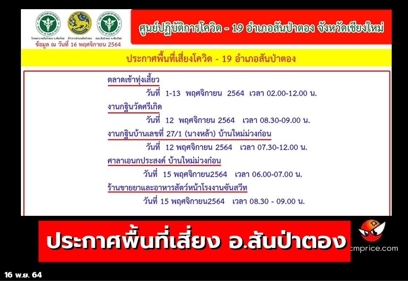 16 พฤศจิกายน 2564 ศูนย์ปฏิบัติการโควิด-19 อำเภอสันป่าตอง จังหวัดเชียงใหม่ ประกาศพื้นที่เสี่ยงโควิด-19 อำเภอสันป่าตอง ดังนี้