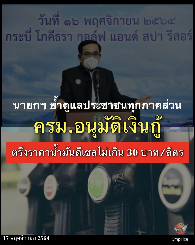 (16 พ.ย.64) เวลา 13.15 น. ณ ห้องประชุมโภคีธารา โรงแรมโซฟิเทล กระบี่ โภคีธรา กอล์ฟ แอนด์ สปา รีสอร์ท พลเอก ประยุทธ์ จันทร์โอชา นายกรัฐมนตรีและรัฐมนตรีว่าการกระทรวงกลาโหม กล่าวถึงแนวทางในการดูแลราคาน้ำมันขณะนี้ว่า รัฐบาลดูแลประชาชนทุกภาคส่วน ให้ดีที่สุด ยืนยันที่จะตรึงราคาดีเซลให้ไม่เกิน 30 บาท/ลิตร โดยที่ประชุมเห็นชอบร่างหลักเกณฑ์การกู้เงินของสำนักงานกองทุนน้ำมันเชื้อเพลิง (สกนช.) โดยให้ สกนช. ดำเนินการกู้เฉพาะวงเงิน 20,000 ล้านบาท ตามกรอบของกฎหมายกองทุนน้ำมันเชื้อเพลิงที่มีอยู่เพื่อพยุงราคาและเตรียมพร้อมสภาพคล่องในการตรึงราคาน้ำมันดีเซลไม่ให้เกิน 30 บาท/ลิตร เพื่อลดผลกระทบต่อค่าครองชีพประชาชนในช่วงที่สถานการณ์ราคาน้ำมันในตลาดโลกยังคงมีแนวโน้มผันผวน และคาดว่าเมื่อสถานการณ์การเข้าสูภาวะปกติราคาน้ำมันก็จะลดลง และในอนาคตต้องมีการสนับสนุนให้มีการใช้พลังงานไฟฟ้าในประเทศ 30% ด้วย พร้อมขอความเข้าใจจากตัวแทนผู้ประกอบการขนส่งรถบรรทุกทั่วประเทศ อย่าใช้แรงกดดันรัฐบาลเพราะต้องดูแลประชาชนทุกกลุ่มและต้องพิจารณาด้วยความละเอียดรอบคอบ และขอให้คำนึงถึงสถานการณ์ที่เกิดขึ้นกับประเทศในขณะนี้ อย่างไรก็ตามได้สั่งการให้กระทรวงคมมนาคมไปจัดขนส่งทางรถไฟ และจัดรถ บขส. สำหรับขนส่งสินค้าอีกทางหนึ่งเพิ่มเติม