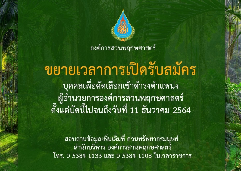 องค์การสวนพฤกษศาสตร์ กระทรวงทรัพยากรธรรมชาติและสิ่งแวดล้อม (รัฐวิสาหกิจ) ขยายเวลาการเปิดรับสมัครบุคคลเพื่อคัดเลือกเข้าดำรงตำแหน่งผู้อำนวยการองค์การสวนพฤกษศาสตร์ ตั้งแต่บัดนี้ไปจนถึงวันที่ 11 ธันวาคม 2564