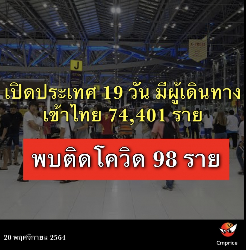 | • เปิดประเทศ 19 วัน มีผู้เดินทางเข้าไทย 74,401 ราย ติดโควิด-19 สะสม 98 ราย |