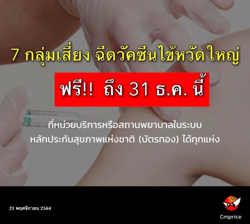 ขอเชิญคนไทยทุกสิทธิการรักษาไปฉีดวัคซีนไข้หวัดใหญ่ฟรีได้ตั้งแต่วันนี้จนถึงวันที่ 31 ธันวาคมนี้ ที่หน่วยบริการหรือสถานพยาบาลในระบบหลักประกันสุขภาพแห่งชาติ (บัตรทอง) ได้ทุกแห่ง โดยไม่เสียค่าใช้จ่าย