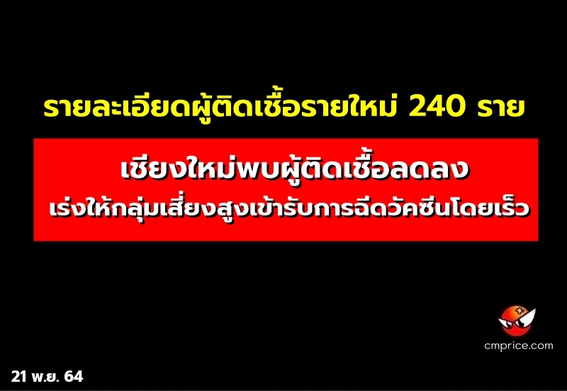 สถานการณ์โรคโควิด-19 จังหวัดเชียงใหม่ วันนี้ (21 พ.ย. 64) พบผู้ติดเชื้อรายใหม่ลดลงเหลือเพียง 240 ราย เป็นผู้ติดเชื้อในจังหวัดทั้งหมด โดยมาจากคลัสเตอร์ต่าง ๆ ประกอบด้วย คลัสเตอร์ใหม่และคลัสเตอร์ที่มีการระบาดต่อเนื่อง 21 ราย ได้แก่ คลัสเตอร์ห้างสรรพสินค้าเซ็นทรัลแอร์พอร์ตพลาซ่า พบเพิ่ม 7 ราย ยอดรวม 14 ราย โดยมีการกระจายไปหลายร้านในห้างดังกล่าว, คลัสเตอร์บ้านกองปะ หมู่ 7 ตำบลบ่อสลี อำเภอฮอด 6 ราย, คลัสเตอร์ไซต์งานก่อสร้างสนามกีฬา มหาวิทยาลัยราชภัฏ วิทยาเขตสะลวง-ขี้เหล็ก อำเภอแม่ริม 3 ราย, คลัสเตอร์กลุ่มทำนา หมู่ 7 ตำบลเมืองแหง อำเภอเวียงแหง 2 ราย และคลัสเตอร์สำนักงานชลประทานที่ 1 เชียงใหม่ 1 ราย นอกนั้นเป็นคลัสเตอร์เล็กๆ พบผู้ติดเชื้อรายใหม่คลัสเตอร์ละ 1 ราย