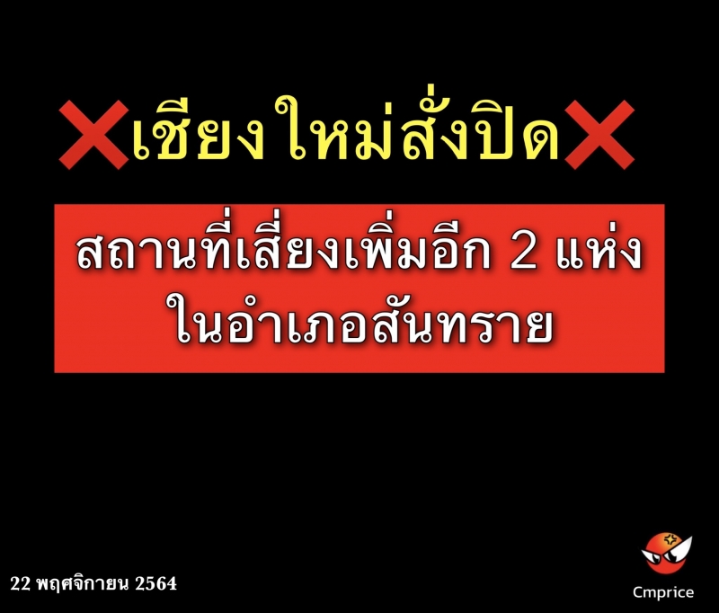 | • เชียงใหม่ ปิดสถานที่เสี่ยงเพิ่มอีก 2 แห่ง ในอำเภอสันทราย |