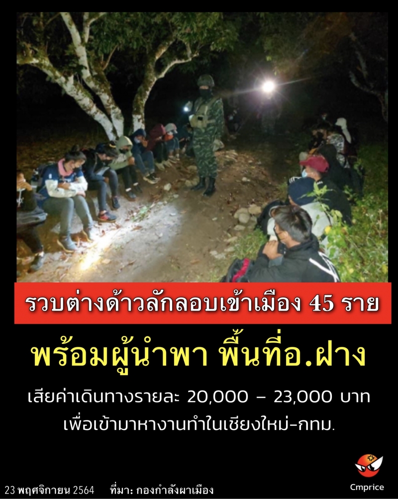 เช้ามืดของวันที่  23 พ.ย. 64 กองกำลังผาเมือง โดย หน่วยเฉพาะกิจกรมทหารม้าที่ 4 ทำการลาดตระเวนเฝ้าตรวจบริเวณในพื้นที่ชายแดน บ.บ้านถ้ำ ต.เเม่งอน อ.ฝาง จ.เชียงใหม่ ได้จับกุมผู้ลักลอบเข้าเมืองโดยผิดกฎหมาย สัญชาติเมียนมา จำนวน 45 คน พร้อมผู้นำพา สัญชาติเมียนมา  จำนวน 1 คน ทราบชื่อคือนายไซ  ซอม อายุ 25 ปี ที่อยู่ต.หนองหอย อ.เมืองเชียงใหม่ เขียงใหม่