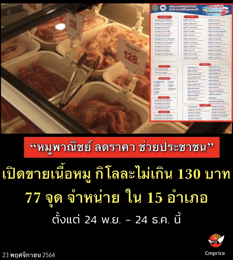 โดยสำนักงานพาณิชย์จังหวัดเชียงใหม่ ได้ร่วมกับสมาคมผู้เลี้ยงสุกรภาคเหนือ และผู้ประกอบการค้าเนื้อสุกรในพื้นที่จังหวัดเชียงใหม่ จัดจำหน่ายเนื้อสุกรชำแหละ (หมูเนื้อแดง) กิโลกรัมละ ไม่เกิน 130 บาท ซึ่งเป็นราคาที่ต่ำกว่าราคาขายปลีกในตลาดสดทั่วไป ครอบคลุม 77 จุด จำหน่าย ใน 15 อำเภอ ตั้งแต่วันที่ 24 พฤศจิกายน ถึง 24 ธันวาคม 2564 นี้
