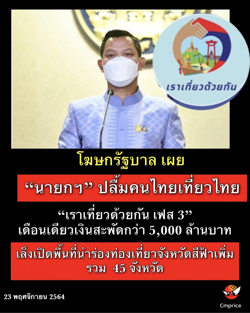 นายธนกร วังบุญคงชนะ โฆษกประจำสำนักนายกรัฐมนตรี เปิดเผยว่า พลเอก ประยุทธ์ จันทร์โอชา นายกรัฐมนตรีและรัฐมนตรีว่าการกระทรวงกลาโหม ปลื้มผลตอบรับหลังมาตรการเปิดประเทศตั้งแต่วันที่ 1 พฤศจิกายน 2564 ในพื้นที่17 จังหวัดสีฟ้า หรือ พื้นที่นำร่องท่องเที่ยว ได้รับการตอบรับเป็นอย่างดีจากทั้งนักท่องเที่ยวชาวต่างชาติ และนักท่องเที่ยวชาวไทย ตั้งแต่มีการเปิดให้ลงทะเบียนตั้งแต่เดือนตุลาคม มีประชาชนมั่นใจออกเดินทางท่องเที่ยวทั่วประเทศผ่านโครงการ “เราเที่ยวด้วยกัน เฟส 3” ทำให้มีเม็ดเงินภายในระยะเวลา 1 เดือนที่ผ่านมา เข้าสู่ระบบภาคอุตสาหกรรมท่องเที่ยวและบริการแล้วกว่า 5,186.1 ล้านบาท ยอดรวมการลงทะเบียน 909,937 คน ยอดการใช้สิทธิ์จองโรงแรมที่พัก 4,113 แห่ง คิดเป็น 1,296,872 ห้อง โดยมีมูลค่าการใช้จ่ายโรงแรม/ที่พัก รวม 4,753.9 ล้านบาท และยอดการใช้จ่ายคูปองส่วนลดในร้านอาหาร สถานที่ท่องเที่ยว ร้านสปา/นวด และอื่น ๆ รวม 435.6 ล้านบาท (ข้อมูล ณวันที่ 20 พ.ย. 64) รวมทั้งในช่วงเทศกาลลอยกระทง อัตราการเข้าพักในช่วงวันหยุดเสาร์ - อาทิตย์ ในหลายพื้นที่ขยับเพิ่มขึ้นกว่าร้อยละ 50 โดยเฉพาะในบางจังหวัดใกล้กรุงเทพมหานคร มีอัตราการเข้าพักในช่วงวันหยุดเพิ่มขึ้นถึงร้อยละ 80 – 90