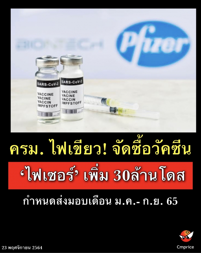 | • ครม. ไฟเขียวจัดซื้อวัคซีน ไฟเซอร์ เพิ่ม 30ล้านโดส กำหนดส่งมอบเดือน ม.ค.- ก.ย. 2565 |