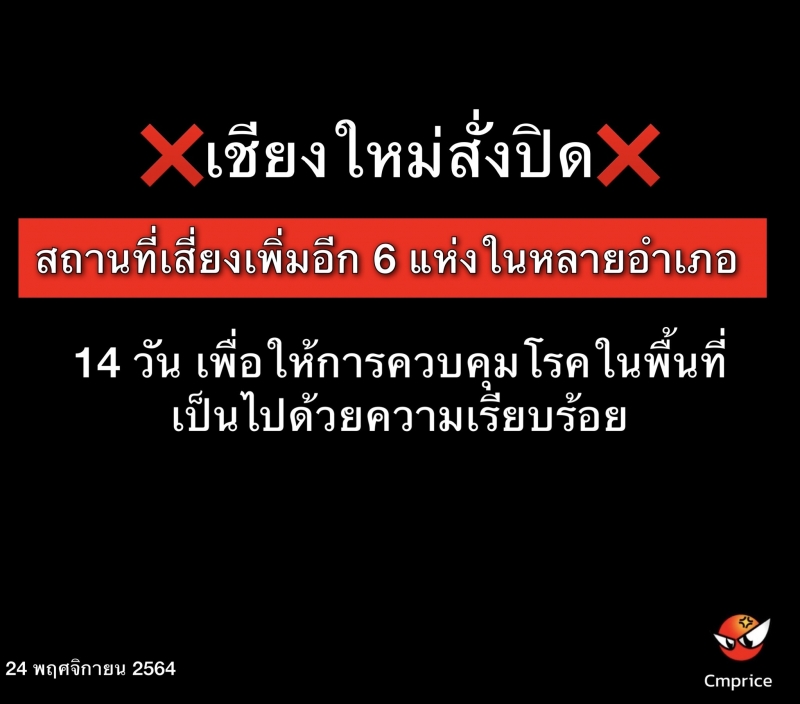 เชียงใหม่สั่งปิดสถานที่เสี่ยงเพิ่มอีก 6 แห่งในหลายอำเภอ 14 วัน เพื่อให้การควบคุมโรคในพื้นที่เป็นไปด้วยความเรียบร้อย