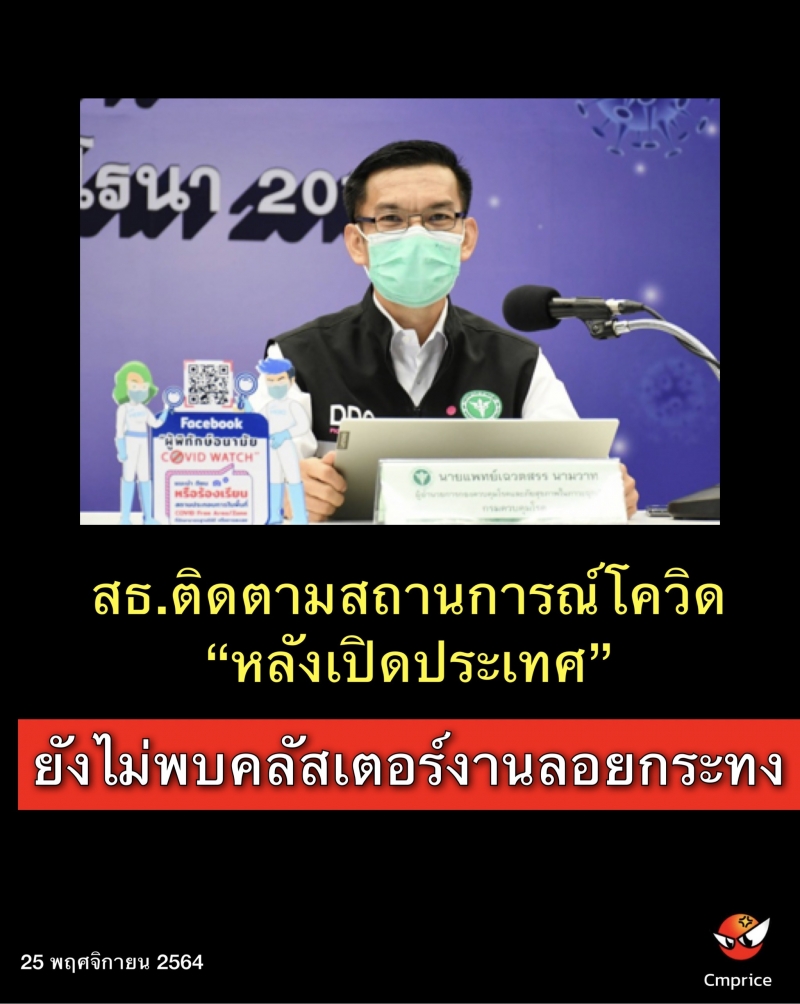 วันนี้ (24 พฤศจิกายน 2564) ที่ศูนย์แถลงข่าวสถานการณ์โรคติดเชื้อไวรัสโคโรนา 2019 กระทรวงสาธารณสุข จ.นนทบุรี นพ.เฉวตสรร นามวาท ผู้อำนวยการกองควบคุมและภัยสุขภาพในภาวะฉุกเฉิน กรมควบคุมโรค แถลงสถานการณ์โรคโควิด 19 ว่า วันนี้ประเทศไทยพบผู้ป่วยรักษาหาย 7,318 ราย สูงกว่าผู้ติดเชื้อใหม่ที่พบ 5,857 ราย เสียชีวิต 55 ราย ผู้ป่วยปอดอักเสบและใส่เครื่องช่วยหายใจลดลงต่อเนื่อง จุดสำคัญในการติดตามสถานการณ์เมื่อฉีดวัคซีนทั่วถึง คือ จำนวนเตียงและอัตราการครองเตียง ซึ่งข้อมูลถึงวันที่ 23 พฤศจิกายน มีผู้เข้ารับการรักษา 69,588 ราย จำนวนเตียงคงเหลือ 132,007 เตียง ระดับเขตสุขภาพ อัตราครองเตียง 33% ส่วน กทม. อัตราครองเตียง 51% หลังการเปิดประเทศต้องติดตามเปลี่ยนแปลงของอัตราการครองเตียงต่อเนื่อง แต่ภาพรวมสถานการณ์การระบาดมีแนวโน้มลดลง ยกเว้นบางพื้นที่ยังพบคลัสเตอร์เพิ่มขึ้นบ้าง ต้องจับตาเป็นพิเศษ โดยคลัสเตอร์ที่พบขณะนี้ มีทั้งโรงงาน/สถานประกอบการ ตลาด งานศพ งานกฐิน และงานแต่ง จึงขอให้ผู้จัดงานเข้มมาตรการป้องกันและใช้เวลาให้กระชับที่สุด หลีกเลี่ยงการพูดคุย เปิดหน้ากาก รับประทานอาหารร่วมกันซึ่งเป็นความเสี่ยง ส่วนการติดเชื้อในแรงงานต่างด้าว ข้อมูล 7 วันย้อนหลัง พบผู้ติดเชื้อรวม 44,768 ราย คลัสเตอร์ที่พบแรงงานต่างด้าว คือ โรงงาน/สถานประกอบการ เป็นเมียนมา 10%, แคมป์คนงาน เป็นเมียนมา 38.5% กัมพูชา 30.8% และคลัสเตอร์พิธีกรรมศาสนา เป็นเมียนมา 10%
