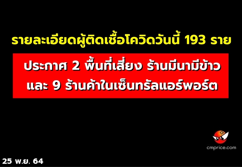 รายละเอียดผู้ติดเชื้อโควิดวันนี้193 ราย ประกาศ 2 พื้นที่เสี่ยง ร้านมีนามีข้าว และ 9 ร้านค้าในเซ็นทรัลแอร์พอร์ต
