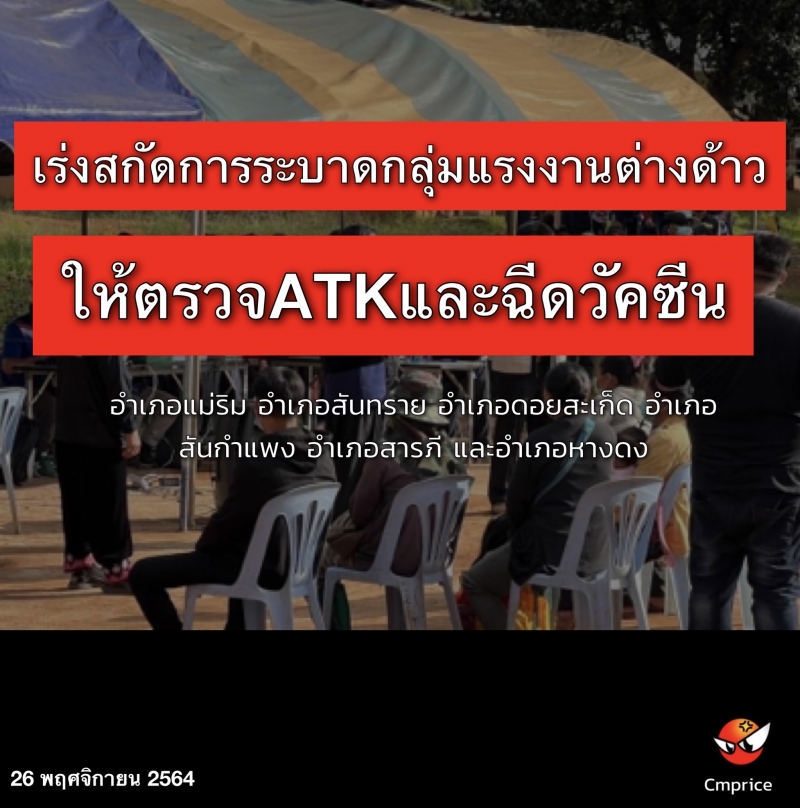 ให้ตรวจATKและฉีดวัคซีน พื้นที่อำเภอแม่ริม อำเภอสันทราย อำเภอดอยสะเก็ด อำเภอสันกำแพง อำเภอสารภี และอำเภอหางดงหลังยังพบว่ามีการแพร่ระบาดและการติดเชื้อเป็นกลุ่มก้อนในกลุ่มแรงงานต่างด้าว