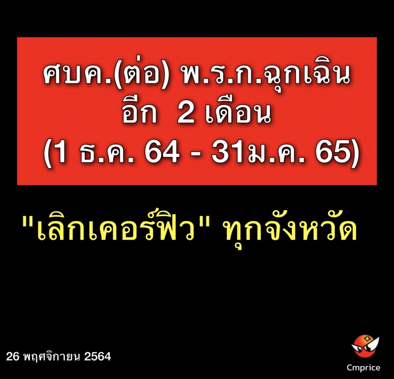 | • ศบค.ต่อ พ.ร.ก.ฉุกเฉิน 2 เดือน (1 ธ.ค. 64 - 31ม.ค. 65) และยกเลิกพื้นที่แดงเข้ม |