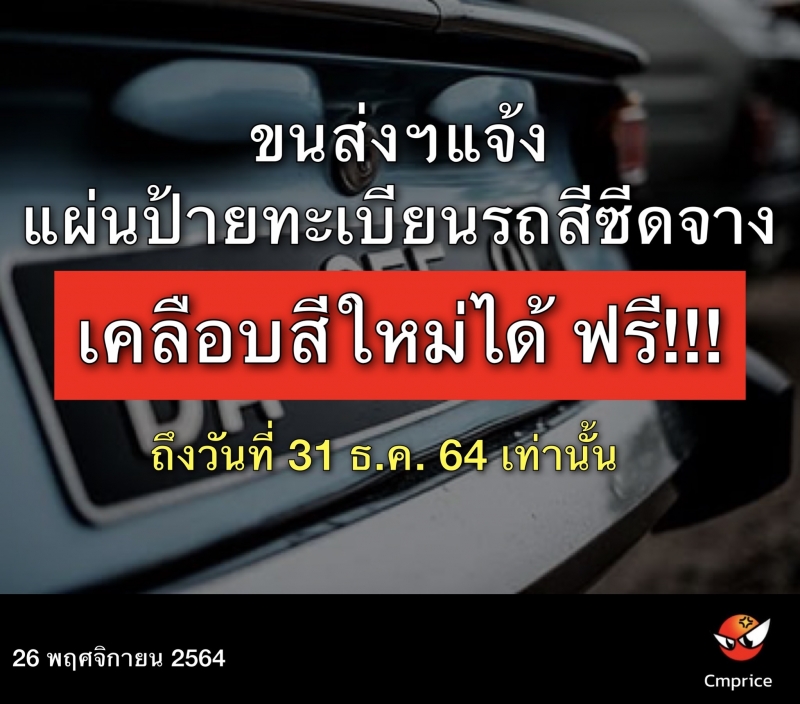 | • ขนส่งฯแจ้งแผ่นป้ายทะเบียนรถสีซีดจาง เคลือบสีใหม่ได้ ฟรี!!! ถึงวันที่ 31 ธันวาคม 2564 เท่านั้น |