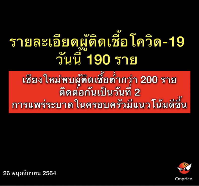 วันนี้ (26 พ.ย. 64) ดร.ทรงยศ คำชัย หัวหน้ากลุ่มงานควบคุมโรคติดต่อ สำนักงานสาธารณสุขจังหวัดเชียงใหม่ เปิดเผยสถานการณ์โรคโควิด-19 จังหวัดเชียงใหม่ ประจำวัน ว่า ผู้ติดเชื้อรายใหม่ลดลงเหลือเพียง 190 ราย เป็นผู้ติดเชื้อที่เดินทางมาจากต่างจังหวัด 7 ราย ที่เหลืออีก 183 ราย เป็นผู้ติดเชื้อในจังหวัด โดยมาจากคลัสเตอร์ใหม่ และคลัสเตอร์ที่มีการระบาดต่อเนื่อง ทั้งหมด 20 ราย ได้แก่ คลัสเตอร์ใหม่ ที่ บ้านห้วยเต่ารู หมู่ 8 ตำบลสะลวง อำเภอแม่ริม 6 ราย ,คลัสเตอร์เซ็นทรัลเฟสติวัล 3 ราย เป็นการติดเชื้อในกลุ่มพนักงานกะ A ซึ่งทางห้างได้มีแผนรองรับให้ผู้สัมผัสเสี่ยงสูงกักตัว และนำพนักงานกะ B มาปฏิบัติงานแทน ถือว่ามีความปลอดภัยสูง เป็นตัวอย่างที่ดี ,คลัสเตอร์บ้านห้วยจะค่าน หมู่ 9 ตำบลปิงโค้ง อำเภอเชียงดาว 3 ราย ,คลัสเตอร์ทีมฟุตบอล VL Academy โรงเรียนวชิราลัยอำเภอสารภี 2 ราย และคลัสเตอร์ตลาดแม่คือ อำเภอดอยสะเก็ด 1 ราย นอกนั้นเป็นคลัสเตอร์เล็กๆ พบผู้ติดเชื้อรายใหม่คลัสเตอร์ละ 1 ราย