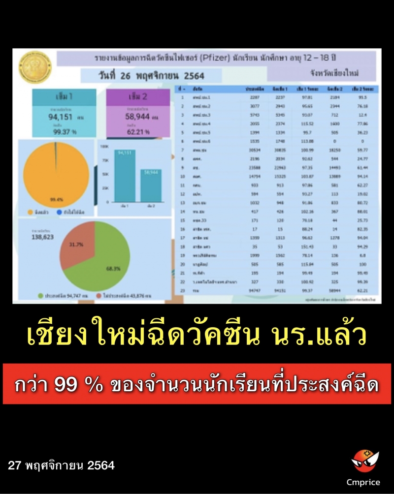 นางยุพิน บัวคอม ศึกษาธิการจังหวัดเชียงใหม่ เปิดเผยว่า จากการสำรวจข้อมูล ณ วันที่ 26 พฤศจิกายน 2564 จังหวัดเชียงใหม่มีกลุ่มนักเรียนอายุ 12-18 ปี ในสถานศึกษาทั้งหมด 138,623 คน โดยมีนักเรียนที่แจ้งความจำนง ต้องการฉีดวัคซีน จำนวน 94,747 คน คิดเป็นร้อยละ 68.3 ของจำนวนนักเรียนทั้งหมด โดยขณะนี้จังหวัดเชียงใหม่สามารถฉีดวัคซีน ไฟเซอร์เข็มที่ 1 ในกลุ่มนักเรียนไปได้แล้ว 94,151 คน คิดเป็นร้อยละ 99.4 ของจำนวนนักเรียนที่ประสงค์ฉีดทั้งหมด ส่วนเข็มที่ 2 ฉีดไปแล้ว 58,944 คน คิดเป็นร้อยละ 62.21 นอกจากนี้ยังมีนักเรียนที่แจ้งความประสงค์ฉีดเพิ่มเติมอีก 15,013 คน