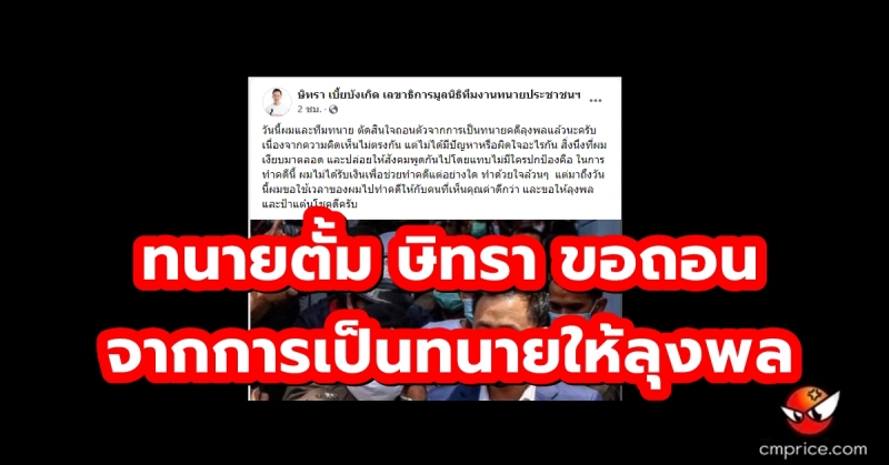 บ่ายวันนี้ เป็นที่ฮือฮา เมื่อ ‘ทนายตั้ม’ ษิทรา เบี้ยบังเกิด ถอนจากการเป็นทนายให้นายไชยพล วิภา (ลุงพล) โดยได้โพสต์ผ่านเพจษิทรา เบี้ยบังเกิด เลขาธิการมูลนิธิทีมงานทนายประชาชนฯ ซึ่งมีข้อความดังนี้