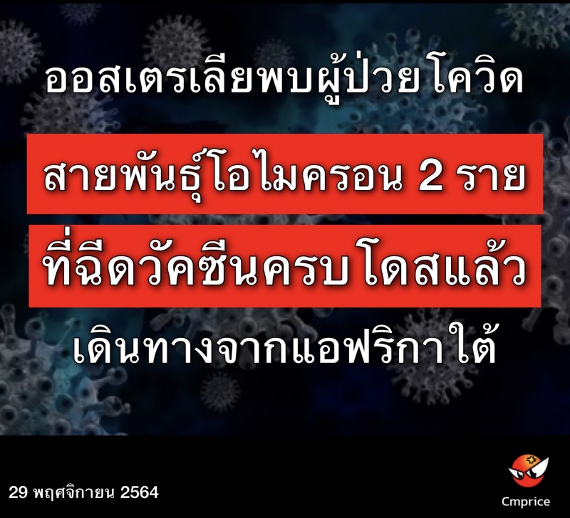 | • ออสเตรเลียพบผู้ป่วยโควิดสายพันธุ์โอไมครอนครั้งแรก 2 ราย ที่ฉีดวัคซีนครบโดสแล้ว เดินทางมาจากแอฟริกาใต้ |