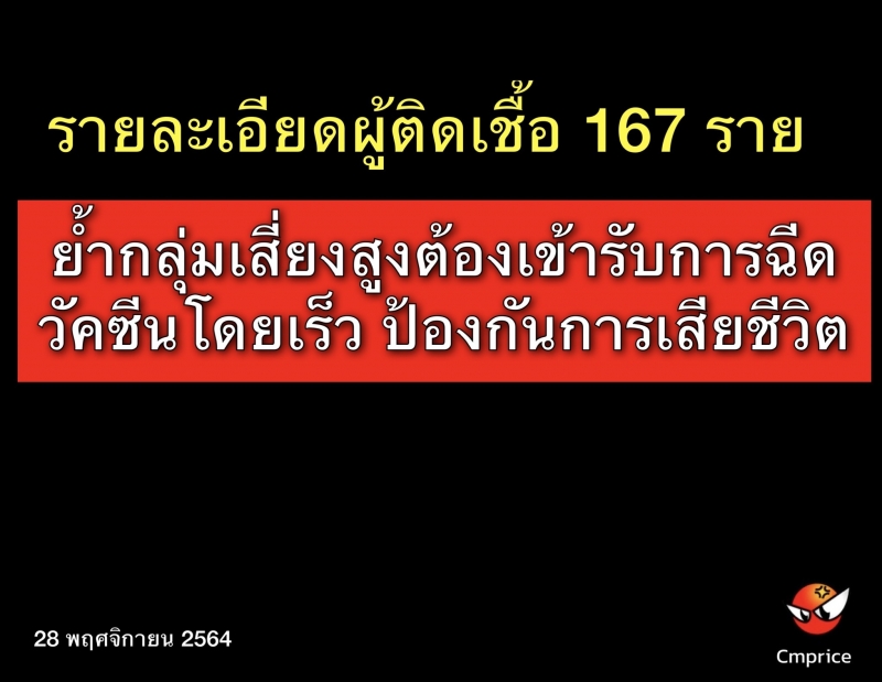 วันนี้ (29 พ.ย. 64) ดร.ทรงยศ คำชัย หัวหน้ากลุ่มงานควบคุมโรคติดต่อ สำนักงานสาธารณสุขจังหวัดเชียงใหม่ เปิดเผยสถานการณ์โรคโควิด-19 จังหวัดเชียงใหม่ ประจำวัน ว่า ผู้ติดเชื้อรายใหม่ลดลงเหลือเพียง 167 ราย เป็นผู้ติดเชื้อที่เดินทางมาจากต่างจังหวัดเพียง 3 ราย ที่เหลืออีก 164 ราย เป็นผู้ติดเชื้อภายในจังหวัด โดยมาจากคลัสเตอร์ใหม่และที่มีการระบาดต่อเนื่อง ทั้งหมด 22 ราย ประกอบด้วย คลัสเตอร์ใหม่ ที่หอพักข้างวัดตำหนัก หมู่ 1 ตำบลแม่เหียะอำเภอเมืองเชียงใหม่ พบผู้ติดเชื้อรายใหม่ 10 ราย และคลัสเตอร์ใหม่ ที่เซ็นทรัลแอร์พอร์ตพลาซ่า ซึ่งเป็นการระบาดในโซน Food Cort 2 ราย ด้านคลัสเตอร์ที่มีการระบาดต่อเนื่อง ได้แก่ คลัสเตอร์ไซต์งานก่อสร้าง หมู่ 1 ตำบลท่าศาลาอำเภอเมืองเชียงใหม่ 5 ราย ,คลัสเตอร์ข้าวต้มย้ง สาขา 1 ตำบลสุเทพ อำเภอเมืองเชียงใหม่ 2 ราย โดยระบาดไปทั้ง2 สาขาแล้ว ,คลัสเตอร์บ้านปางอีกา หมู่ 8 ตำบลแม่แรม อำเภอแม่ริม 1 ราย และคลัสเตอร์ห้างทองเยาวราชกรุงเทพสาขา Big C ดอนจั่น 1 ราย