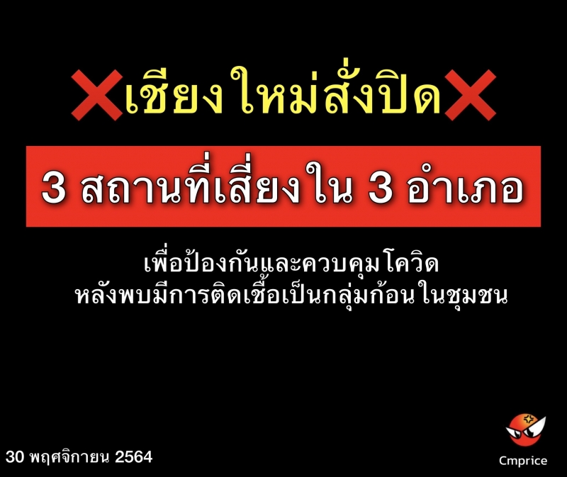 คณะกรรมการโรคติดต่อจังหวัดเชียงใหม่ มีมติสั่งปิด 3 “สถานที่เสี่ยง” เพื่อควบคุมการแพร่ระบาดของโควิด-19 หลังพบมีการติดเชื้อเป็นกลุ่มก้อนในชุมชน