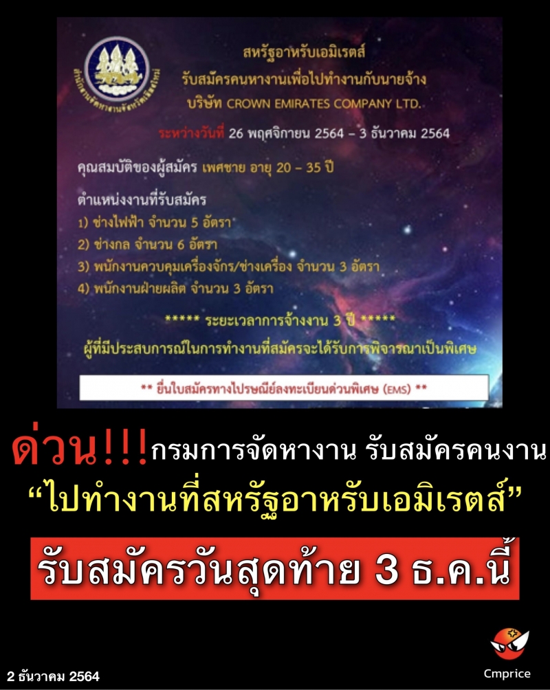 กรมการจัดหางาน รับสมัครคนงานเพื่อไปทำงานกับนายจ้างบริษัท CROWN EMIRATES COMPANY LTD. สหรัฐอาหรับเอมิเรตส์ รับสมัครวันสุดท้าย 3 ธันวาคม นี้