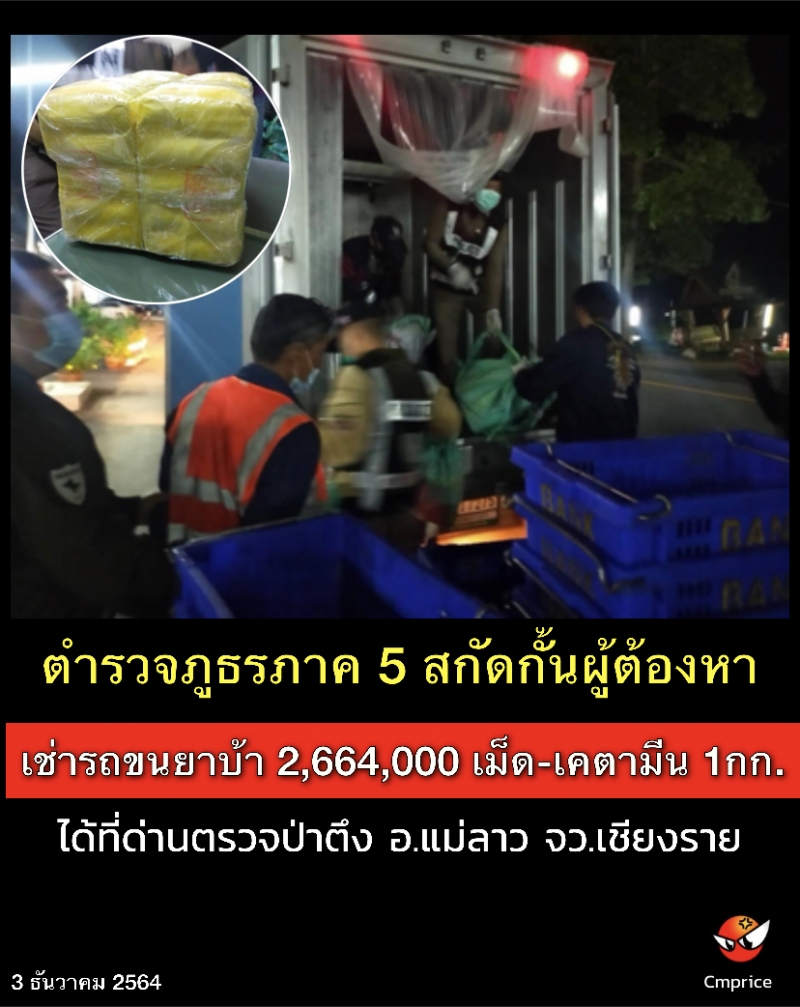 ก่อนเกิดเหตุ เจ้าหน้าที่ บก.สส.ภ.5 ได้สืบทราบ และสะกดรอยรถต้องสงสัยจาก อ.แม่สาย มุ่งหน้าเข้าสู่ อ.เมืองเชียงราย จึงได้ประสานด่านตรวจป่าตึง ให้สกัดจับรถยนต์ ยี่ห้อ อีซูซู สีขาว หมายเลขทะเบียน 2 ฒว 7275 กทม. ซึ่งเป็นรถยนต์กระบะตู้ทึบลักษณะคล้ายรถขนประเภทอาหารทะเลแช่เย็น ซึ่งมีนายอลงกรณ์ฯ ผู้ต้องหาที่ 1เป็นผู้ขับขี่ และมีนางกมลธรฯ ผู้ต้องหาที่ 2 โดยสารมาด้วย จึงขอทำการตรวจค้นพบยาบ้าบรรจุอยู่ในกระสอบปุ๋ยดัดแปลงเป็นกระเป๋าสะพาย จำนวน 25 กระสอบ รวม 2,664,000 เม็ด และเคตามีน จำนวน 1 กก. จึงได้จับกุมผู้ต้องหาพร้อมของกลางส่งพนักงานสอบสวน สภ.แม่ลาว จว.เชียงราย ดำเนินคดีตามกฎหมายต่อไป