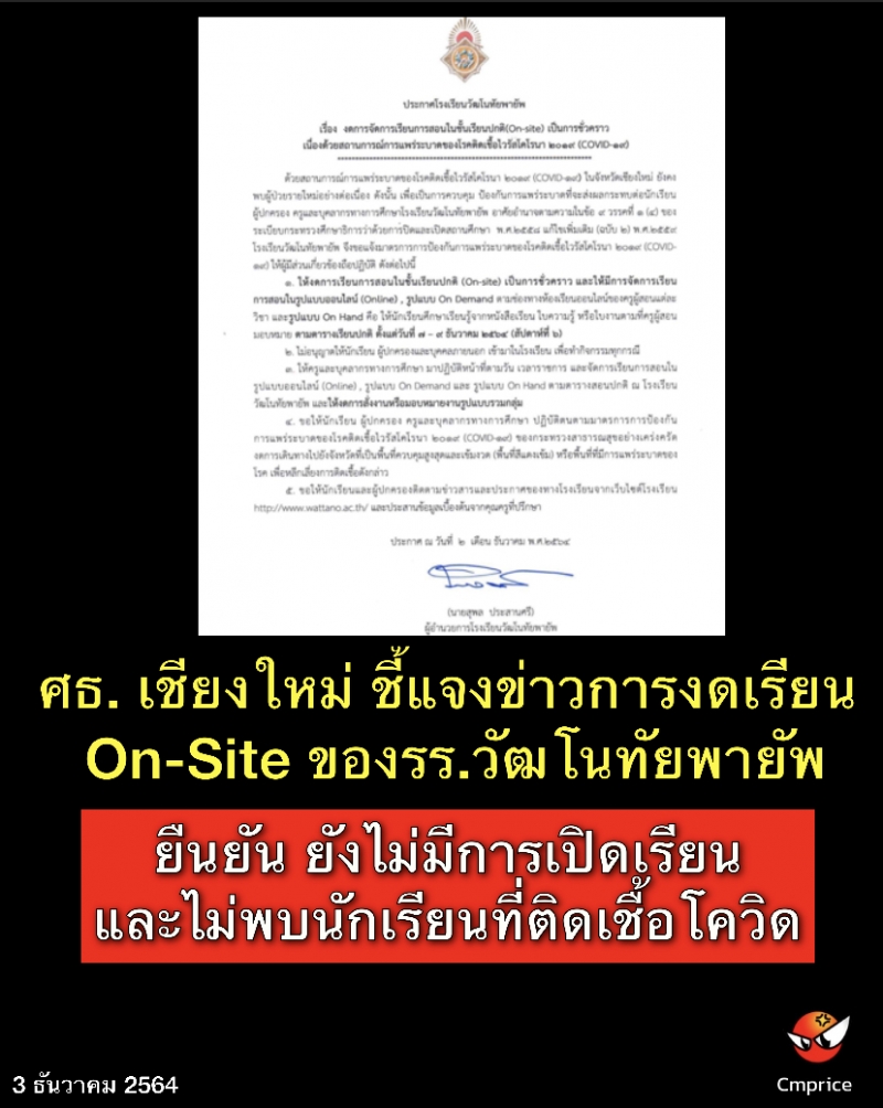 ศึกษาธิการจังหวัดเชียงใหม่ ชี้แจงกรณีข่าวการงดการเรียน On-Site ของโรงเรียนวัฒโนทัยพายัพ ว่าเป็นการขยายเวลางดเรียน On-Site พร้อมยืนยันยังไม่มีการเปิดเรียนและไม่พบนักเรียนที่ติดเชื้อโควิด-19