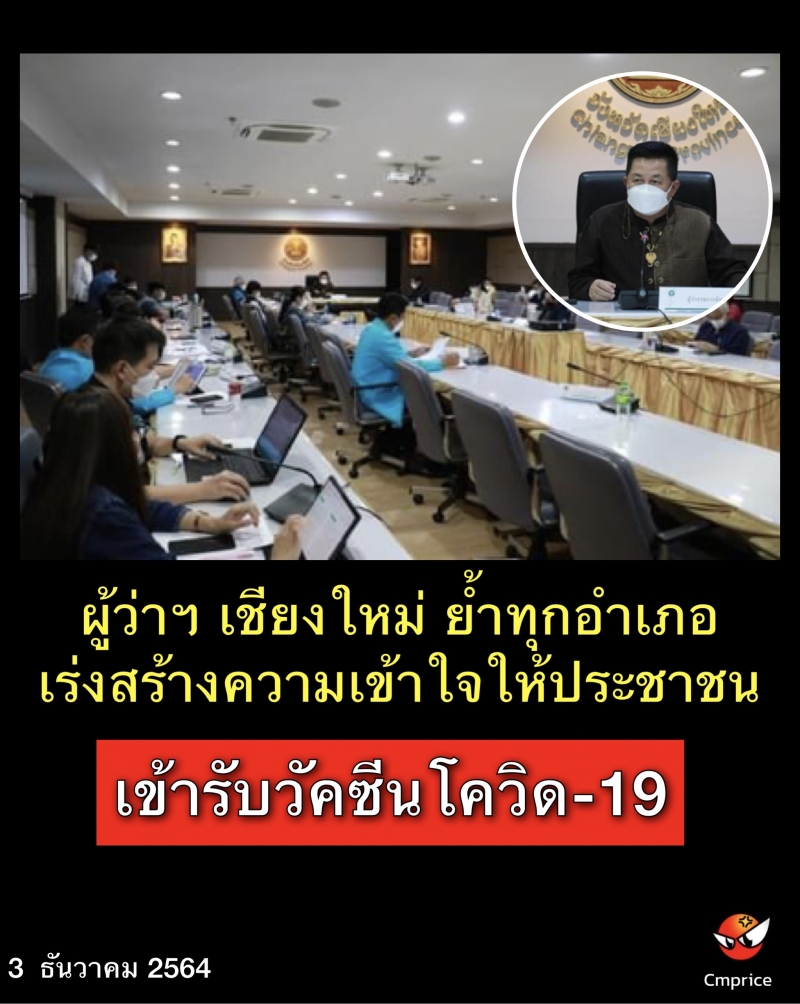 ผู้ว่าราชการจังหวัดเชียงใหม่ เน้นย้ำศูนย์ปฏิบัติการอำเภอทุกอำเภอ เร่งสร้างความเข้าใจให้ประชาชนเข้ารับวัคซีนโควิด-19 เพื่อลดอัตราการเสียชีวิต และสร้างภูมิคุ้มกันหมู่ พร้อมเตรียมมอบรางวัลแก่อำเภอที่ฉีดวัคซีนได้ครบ 100 เปอร์เซ็นต์