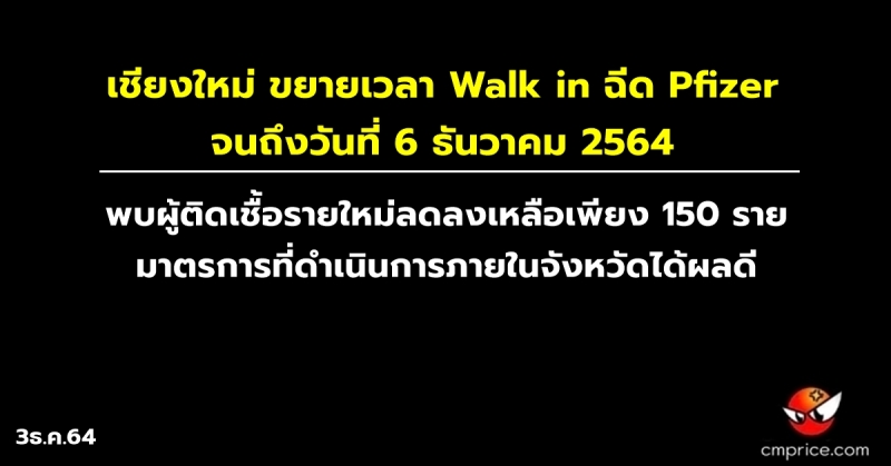 จังหวัดเชียงใหม่ ขยายเวลาแคมเปญพิเศษ Walk in ฉีด Pfizer จนถึงวันที่ 6 ธันวาคม 2564 ส่วนสถานการณ์วันนี้พบผู้ติดเชื้อรายใหม่ลดลงเหลือเพียง 150 ราย ขณะมาตรการที่ดำเนินการภายในจังหวัดได้ผลดี