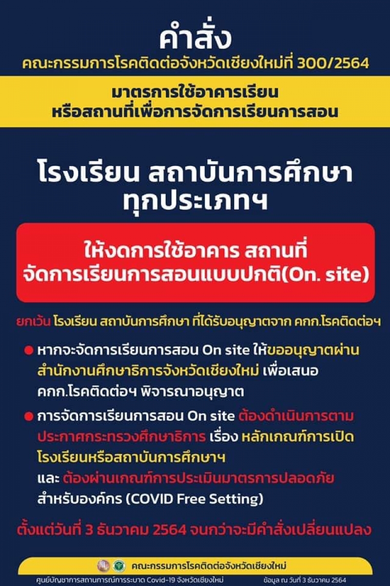 จังหวัดเชียงใหม่ ออกคำสั่งให้โรงเรียน สถาบันการศึกษาทุกประเภท งดใช้อาคารเพื่อจัดการเรียนการสอนในรูปแบบปกติ หรือ On site โดยให้พิจารณาจัดการเรียนการสอนในรูปแบบอื่นแทน ยกเว้นสถานศึกษาที่ได้รับอนุญาตก่อนวันที่ 3 ธันวาคม 2564