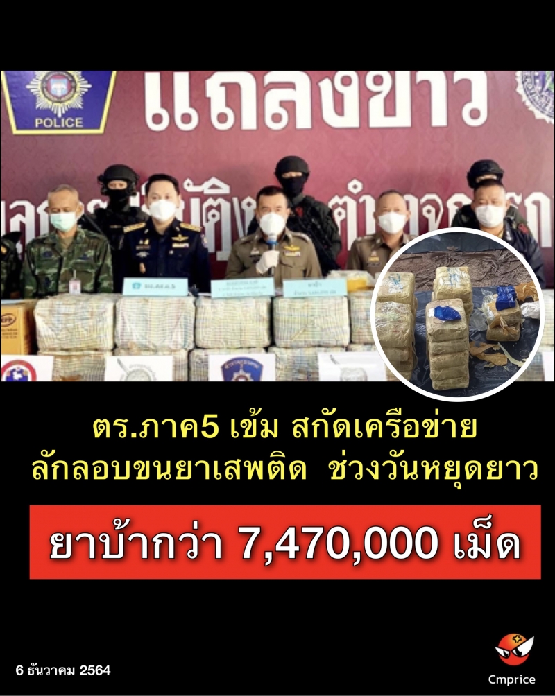 ตร.ภูธรภาค 5 สกัดกั้นเครือข่ายลักลอบขนยาเสพติด ตรวจเข้มช่วงหยุดยาว 3-6 ธ.ค.64 จับกุมยาบ้ารวมกว่า7,470,000 เม็ด และไอซ์ 74 กก.
